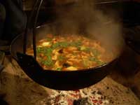 具がよく煮えたら水で戻した麩を軽くしぼって入れる。その後、豆麩も入れる。 白菜、春菊を大きめに刻んで入れ、ひと煮立ちしたらできあがり。