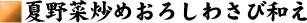 トマトのへたを取る。 ピーマンのへたを取り、種も取って四等分にする。 しいたけ9個のいしづきを取って縦に細く切ったものを網で焼く。 油揚げ2枚を縦に細く切って網で焼く。 なすを、鍋で炒める トマトを鍋で炒めながら、へらで4つに割り、皮をむく ピーマンを鍋でしんなりするまで炒める。 おろしたわさびと、大根おろし、刻んだ大葉を入れ、しょうゆ大さじ3杯でたれをつくる。 炒めた野菜につくったたれをかけ、完成