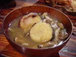 七輪でさつまいもを焼く。 焼けたさつまいもとしめじなどのきのこを、味噌とだしで味付けした鍋に入れ、少々煮込んでいただく。