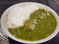 炒めた粉を、煎った大豆を半日水に漬けて得た大豆だしで溶いてルーにし、ほうれん草の鍋に溶かす。 |
