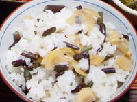 コシヒカリ(うるち米)とヒメノモチ(もち米)を混ぜたものを、炊く。 炊き立てのお米に、山菜の具をよく混ぜてできあがり。