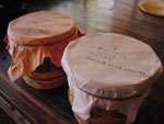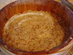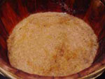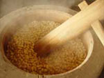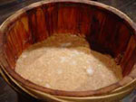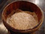 『仕込み』 米麹、麦麹のもとを、温め続けること3日。様子を見てみると、多少、変色しているところもあったが、それぞれ、独特の香りが広がり、順調に発酵していた。 これを、茹でてつぶした大豆としっかり混ぜる。そして、味付けと雑菌の繁殖を抑えるための塩を加えてさらに混ぜ、樽に余分な空気を追い出すために強く投げつけるように移し、仕込み完了。蓋と重石を載せ涼しいところに味噌を寝かせる。 |