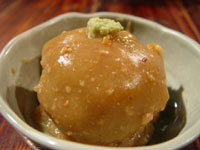 昆布でとっただし汁に玉味噌、みりん、醤油を入れ、とく。最後に酒でといた片栗粉を入れ、味噌あんに。