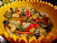 なす(3コ)、ピーマン(3コ)、赤ピーマン(1コ)、黄色ピーマン(1コ)、じゃがいも(3コ)、トマト(3コ)、インゲン(5本)、きゅうり(3本)、唐辛子(3本)、にんにく(1コ)、デカカボチャ(あれば・・・)、塩、コショウ なす、ピーマン、赤ピーマン、黄色ピーマン、じゃがいも、インゲン、きゅうりを、一口大に切る。 オイルをひいた大鍋に、みじん切りにしたにんにくと唐辛子を入れて炒める。 にを豪快に入れて、全体をよく炒める。 よく炒めたら、8等分に切ったトマトと塩を入れて、野菜がしんなりするまで30分くらい煮込む。 煮込んだら、塩、コショウで味を調えて、デカカボチャの大皿に盛って完成。 戻る