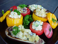 まずは、なす、トマト、ピーマンを活かしたお皿づくりから。いずれも半分に切り、中身をスプーンなどでくりぬく。このとき、なすは軽く火に通しておくと、あとでおいしくいただける。 |