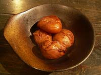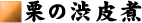栗(ざる1杯)、砂糖 栗のイガをとり、皮を剥きやすくするため、実を水に1晩浸けておく。 栗の下部に亀裂を入れ、鬼皮(固い皮)を剥いていく。 皮をむいた栗を水で洗う。 多めのお湯に栗を入れ、10分間ほど煮込む。 ザルの上に栗をあけ、水で洗い、表面をきれいにする。 水気を切ったら、再び鍋に入れかぶるくらいの水を入れ、同量の砂糖を入れる。和紙で落し蓋をして1時間ほど煮込んで完成。 1昼夜そのままにしておくと、中身まで味が染み込んでさらにおいしくなる。 戻る