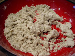 6.水回し ねり鉢に入れたつなぎの山芋を混ぜたそば粉に、水を全体に行き渡るように少しずつ注ぎ、均等に混ぜてこね、1センチ大くらいの小さな玉をつくっていく。入れる水の割合は、つなぎの山芋の量にあわせて考える。なお、前回は1キログラムのそば粉に対してだいたい400ミリリットル入れた。 |