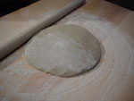 9.延ばし 麺棒を使ってへそ出しをした生地を延ばしていく。 |