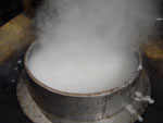 12.茹で かまどで沸かした湯に切ったそばを入れ、2分ほどゆで、さっとあげる。 |