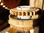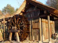 | 3.粉挽き 塵やほこりを取り除いてきれいにしたそばの実は、水車の挽き臼に入れ、水車の力で挽いて粉にする。 |
