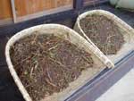 2.脱穀 刈り取って束ねたそばの実を、板に縄を巻いてつくった手づくり脱穀板で、こすって脱穀。 |