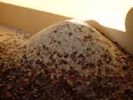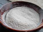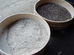 | 4.選別 石臼で挽かれて出てきたそば粉には、挽かれたそば殻が混ざっている。 |