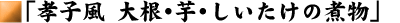 大根(半分)、じゃがいも(3コ)、しいたけ(5コ)、本だし、しょうゆ、砂糖、味りん 大根はいちょう切り、じゃがいもは角切り、しいたけは4つに切る。 切った大根、じゃがいも、しいたけを鍋でぐつぐつ煮込む。 本だし、しょうゆ、砂糖、味りんなどを入れてさらに煮込み、味を調えてできあがり。 戻る