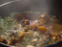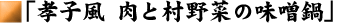 なす(3コ)、ピーマン(3コ)、赤ピーマン(1コ)、黄色ピーマン(1コ)、じゃがいも(3コ)、トマト(3コ)、インゲン(5本)、きゅうり(3本)、唐辛子(3本)、にんにく(1コ)、デカカボチャ(あれば・・・) 大根(1本)、白菜(1玉)、しいたけ(5コ)、豆腐(2丁)、イノシシの肉(お好みで)、味噌(味見をしながら適量を) 切った大根、白菜、しいたけを鍋にたっぷり入れて、煮込む。 ぶくぶくと煮立ってきたら、切った豆腐を入れる。 孝子さん御手製の味噌を入れ、味見をしながら、味を調えていく。 イノシシの肉を入れて、さらに煮込んで、できあがり。 戻る