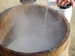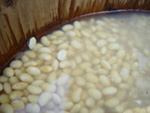 | 1.大豆を一晩、水に浸す。 水を張った樽に、枡、3杯くらいの大豆を入れ、一晩、つける。冬は夏より長い時間、10時間以上つけるとよいという。