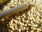 2.ふやけた大豆をすりつぶす。 水を吸ってふくらみ、やわらかくなった大豆を、すり鉢に入れてすりこぎで形がなくなるまで、よくすりつぶす。ペースト状になるまですりつぶすと、黄色っぽかった大豆が、真っ白なものになる。 |