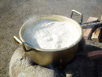 3.すりつぶした大豆を鍋で煮る。 よくすりつぶしてどろどろになった大豆を、鍋に入れ、火にかけて15分程度煮る。このとき、かき混ぜながら煮ないと焦げてしまうため、しゃもじの大きいもので底までよくかき混ぜる。また、火が強くなってふきこぼれないよう注意する。 |