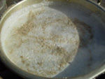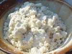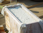 7.型に流し込む。 豆乳が少し固まりだしたら、流し箱やざるなどの型に流し込む。このとき、型の内側には木綿の布を敷いておく。 |