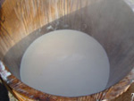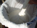 5.布でこして、豆乳とおからに分ける。 大きな樽を用意し、煮たものを布袋で、こす。このとき、こして出てきたものが豆乳で、袋の中に残ったものがおから。豆乳を完全にしぼり出す。 |