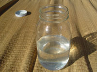 6.にがりをうつ。 にがりとは、海水から得られる成分で、液状の「豆乳」を固めて、「豆腐」にする役割を果たす。 こして得た豆乳に、お湯で溶いたにがりを、少しずつ、カップ半分くらい入れて、かき混ぜる。にがり |