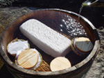 9.水に浸してできあがり。 型の中で固まった豆腐を、きれいな水を張った樽の中に入れる。水の中に入れることで、固くなりすぎたり、にがりの苦味が残ったりすることを防ぐことができる。 水から出したら、切って、盛り付け、DASH村の豆腐、完成。 |