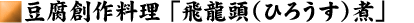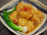 大豆だし、みりん、薄口しょうゆを、8:1:1の割合で合わせ、揚げたものと水気を絞った大根おろし、おろしたしょうが、輪切りにした唐辛子を入れて軽く煮込む。10分ほど煮込んだら、盛り付けてできあがり。 |