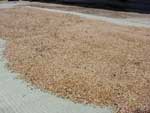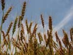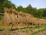1.小麦の収穫 2001年7月、高さ1メートルほどになり、穂も茶色くなった小麦を鎌で刈り取って収穫。はせにかけて干し、よく乾燥させる。 |