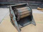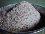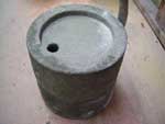 3.粉挽き 小麦を石臼で挽いて、粉にする。石臼の上部にある穴より少しずつ小麦を入れ、取っ手を持って回転させて挽いてゆく。大変重たい石臼を回すのは大仕事で、結構時間がかかる。 |