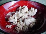 6.水回し ねり鉢に入れた1キログラムの小麦粉に、混ぜ合わせた塩水を全体に行き渡るように注ぎ、均等に混ぜてこね、玉をつくる。まずは、手合わせという粉をすくいあげたり、両手を合わせたりする作業で、全体にまんべんなく水を行き渡らせる。 |