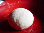 7.こね 玉になったら手の平と指でもみ込んで、弾力性のある玉をつくる。板の上において両手で強くこねて、きめを細かくしていく。生地を回して、つやが出てくるまで、こねる。 |