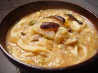 12.茹で 沸かした湯に切ったうどんを入れ、ゆでる。泡が吹きこぼれてきたら、差し水をする。ゆでる時間は太さによるが、DASH村では20分くらいゆでた。ゆでたら、冷水に浸し、麺のぬるみをとるため、水で洗う。 |