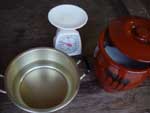 5.塩水をつくる 小麦は、塩水を使って練る。これは、塩を加えると、麺にコシが出る上に、ゆでる際に麺の芯が硬く残らないため。ぬるま湯に食塩を加えて混ぜ合わせる。 |