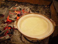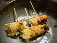 串に刺した湯葉巻きに、酒と合わせたしょうゆをはけで塗りながら、炭火であぶる。こんがり焼けたらできあがり。