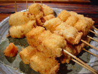 串に刺したものに、水で溶いて混ぜた小麦粉とパン粉をつける。