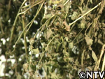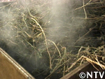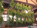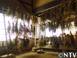 | 収穫した50束の薄荷を、母屋内で陰干しする。陰干しすると、ゆっくりと蒸発する水分が葉の中の不純物を運び出し綺麗な状態の油分が残る。また、花の裏にある気孔が閉じ、油の揮発を防ぐこともできる。 |