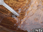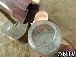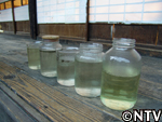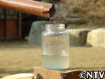| 蒸留水が冷え始めると、少しずつ油が浮いてきた。瓶いっぱいに溜まった蒸留水が全部で計5本できた。 | ||