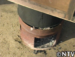 | まずは、蒸留装置を作る。湯を沸かすドラム缶の上に葉を入れる蒸留槽を置く。 蒸留槽は、和紙で楮を蒸したものを改良したもの。蒸気をしっかり液体にしておくために、蒸気の通る鉄の管はしっかりと冷やしておく。 |