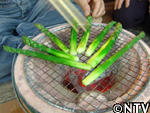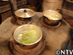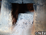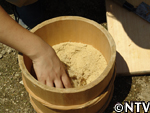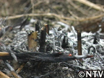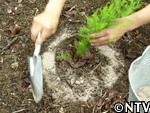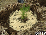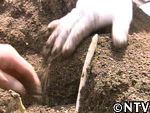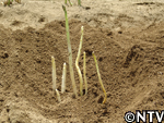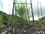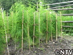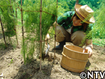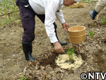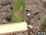 | 定植から1ヶ月。根付かせるため、根の成長に欠かせない養分である「カリウム」を含んだ灰を与える。 灰は、釜戸の底に溜まる木灰を使用した。 さらに、アスパラの茎は成長すると2メートルにもなり、風に弱いので、茎折れを防ぐため竹の支柱で囲んだ。 |