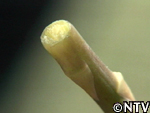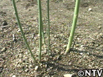 | 茎の長さ75cm、直径0.4cmの若茎が数本出始める。 放っておくと、密着しすぎて、うまく養分を蓄積できないので、細い茎を間引き、養分生産能力が高い太い茎を3〜4本残す。 |