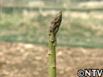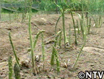 | アスパラガス栽培3年目。太い物で1.3センチ、長さ28cmのものが現れたが、一株あたりの太い若茎の数が少ない。 立茎させる茎が細すぎると根に送る養分量も少ないので、今この段階で太い茎を収穫してしまうと来年も太い茎の本数は期待出来ないので、この年は収穫を断念。 |