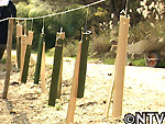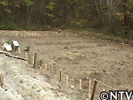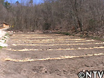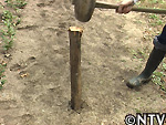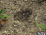 | この年に多発したゲリラ豪雨で茶畑も水浸しになったが斜面の水はけの良さからか特に影響を受ける事はなかったが、畑にはイノシシの足跡が・・・。 主に、穀物などを食い荒らすがミミズも好物。まだ幼いチャノキの根元を荒されかねない。 そこで竹鳴子を、畑全体に囲むように張り巡らせた。 |