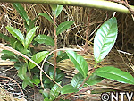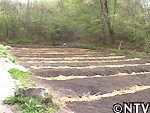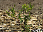 | 譲って頂いた苗を早速、定植することに。定植する場所は霜が降りにくい役場裏の南向きの斜面。比重が重い冷たい空気は斜面を滑るようにして低地へ通過しやすい。 木の地力を充分につけてもらうにはまずは根をしっかりと張ってもらう事が重要。乾燥対策としては敷きワラを敷いた。これは雑草防止にもなる。 計10畝のお茶畑が誕生した。この時、苗の高さは約18cm。長年に渡るお茶栽培の戦いがいよいよこのときから始まった。 |