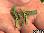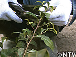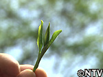 | 茶畑の6割の新芽が一芯三葉に。 晴れ渡り絶好の茶摘み日和となった。摘み方から、その後の加工法まで豊富な知識と経験を持つお茶の達人・赤堀九二男さんを指導者としてお迎えし、いよいよ4年越しの茶摘みを実行する。 お茶摘みのコツは指のひらで切り口をきれいに折ること。達人は手早く摘む。その姿を見て、真似してはみたもののなかなか早く摘めない。慣れて来ると少しずつ早くなったが、達人には遠く及ばなかった。 収量はこの日だけで1kgほどにもなった。 |