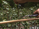 | 上に伸びた枝を切って芯止めすれば、その下に残された新芽達に養分が集中し、枝化が促進され、結果、葉が増える。増えた葉の根元にはまた新たな芽が出来る、というサイクル。剪定の善し悪しは収穫時期の新芽の質と量に大きく影響する。一本ずつ切りどころを吟味しての剪定。 なるべく新芽を多く残すべく、枝で葉層が密になっている所のやや上を剪定した。 剪定し終えた茶畑はあまりに寂しい姿になってしまい、一抹の不安を覚えた・・・。 |