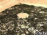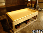 | 工程G 乾燥 揉み上げた茶葉を暖かい台の上に薄く広げる。広げた茶葉の真ん中に丸く空間を持たせる事でそこから熱が放出され焦げにくく出来る。 15分ごとに崩し揉み上げては、また均等に広げる作業を繰り返す事2時間。外はすっかり暗くなっていた。半日以上手を動かし続け、ようやくお茶が完成した。およそ1kgの茶葉が最終的に200gまでになった。 |