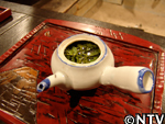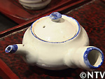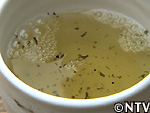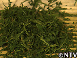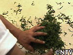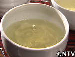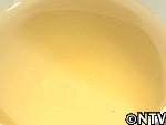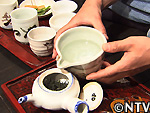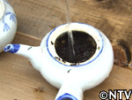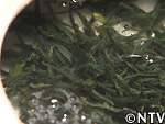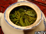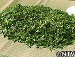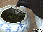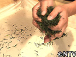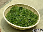 | 煎茶完成 完成した茶葉を早速頂く。手揉み茶の旨みを最も引き出すには、湯の温度=50℃〜70℃。急須で蒸らす時間=約1分。 |