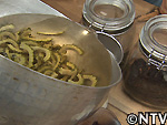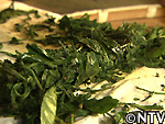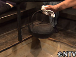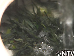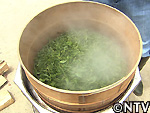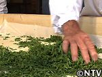 | 工程@ 蒸し[60秒] 摘むと茶葉は酸化がどんどん進行するので、すぐさま100℃の蒸気を茶葉に当て、酵素の働きを止める。蒸し時間がお茶の味を左右する。短ければ浅蒸し、長ければ深蒸し。今回はコクが出る深蒸しにすることに。深蒸しの目安は1分間。蒸気をまんべんなく当て、1分経過したら香りを逃がさぬようすぐさま冷ます。 |