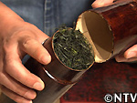 | 心配していた新芽がようやく動き始めていた。例年よりも半月も遅い動きだし。 一般的には、一つの芯に五枚の葉がなる一芯五葉の上部2、3枚を摘むもの。しかし、茶葉は幼ければ幼いほど旨みが凝縮されているという事で、村では一つの芯に3枚の葉がなる一芯三葉の状態で摘む事にした。 3枚の葉が出開くまでおよそ1ヶ月。その間に、茶葉を揉む際に欠かせない作業台「焙炉」を準備する。茶葉を揉む台の部分は和紙とコンニャク糊でつくられる。和紙は丈夫で耐熱性が高い、茶葉の風味を損なわない天然素材。そして、さらに準備していたもの、それが茶筒。竹の節を利用し、漆とマコモ墨でコーティングを施した。これは完成した茶葉の湿気対策にもなる。 |