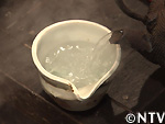 | 工程E 揉み切り ここからが仕上げの段階。 焙炉に戻した茶葉を両手で30cmほどの高さに持ち上げ、細く撚っては落とす。 |