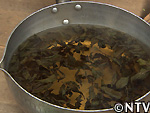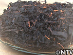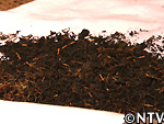 | 工程C 乾燥 2時間後、布を開けて見てみると、放って置いただけの茶葉がかなりの赤さになっている事に驚かされた。 この茶葉を80℃で約30分間焦げないように火にかけ、乾燥させて完成。 乾燥していくにしたがって、風味が増し辺りに広がる紅茶の香りが本当に香ばしくて、早く飲みたいという思いに駆られた。乾燥した茶葉は赤色というより黒に近い褐色に染まり、まさに香りも見た目も紅茶になっていた。 |